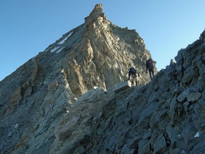 Approaching the Grand Gendarme. This feature is more often avoided by a flanking move left off of the main ridge.